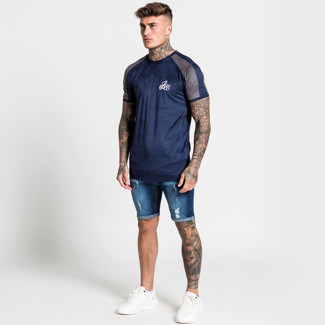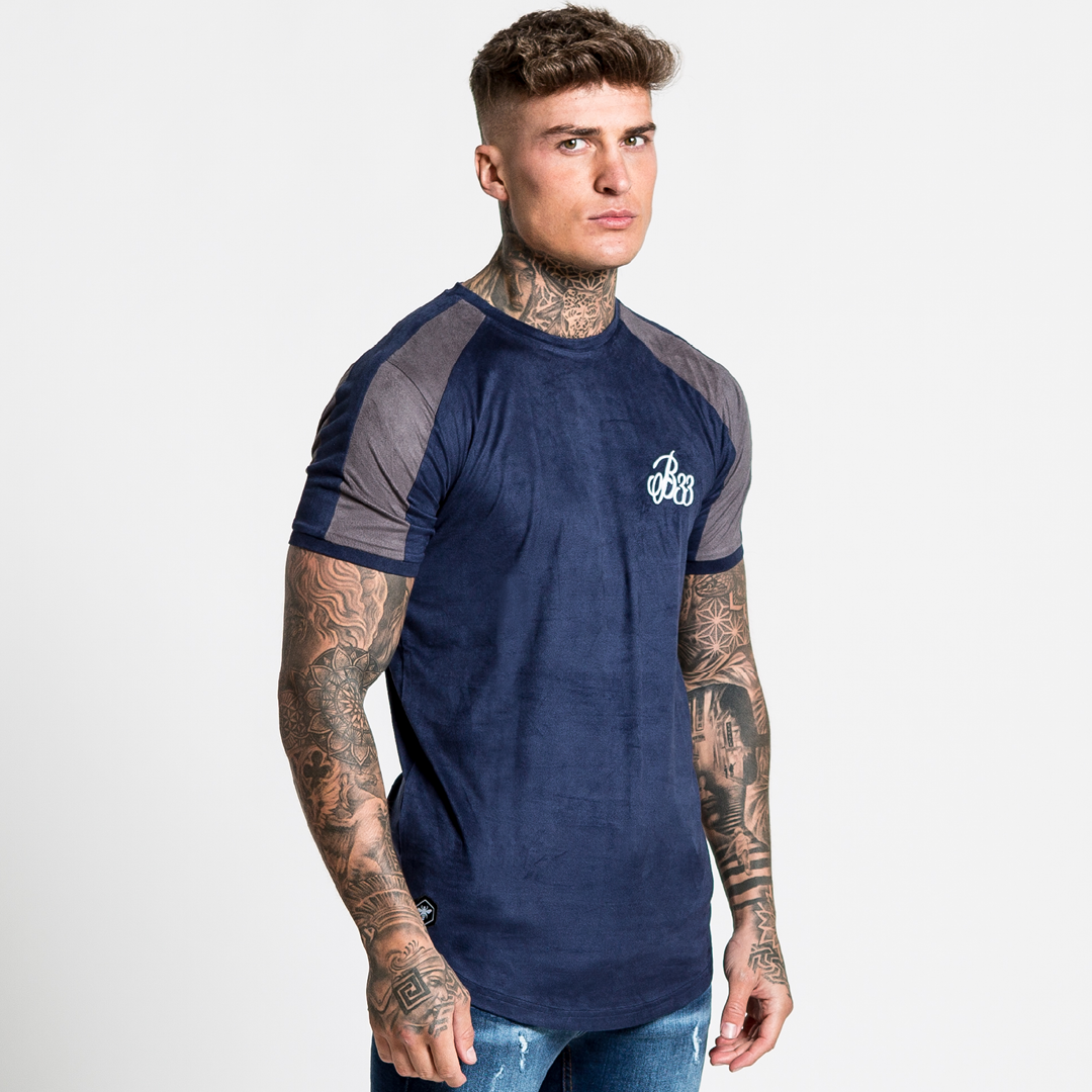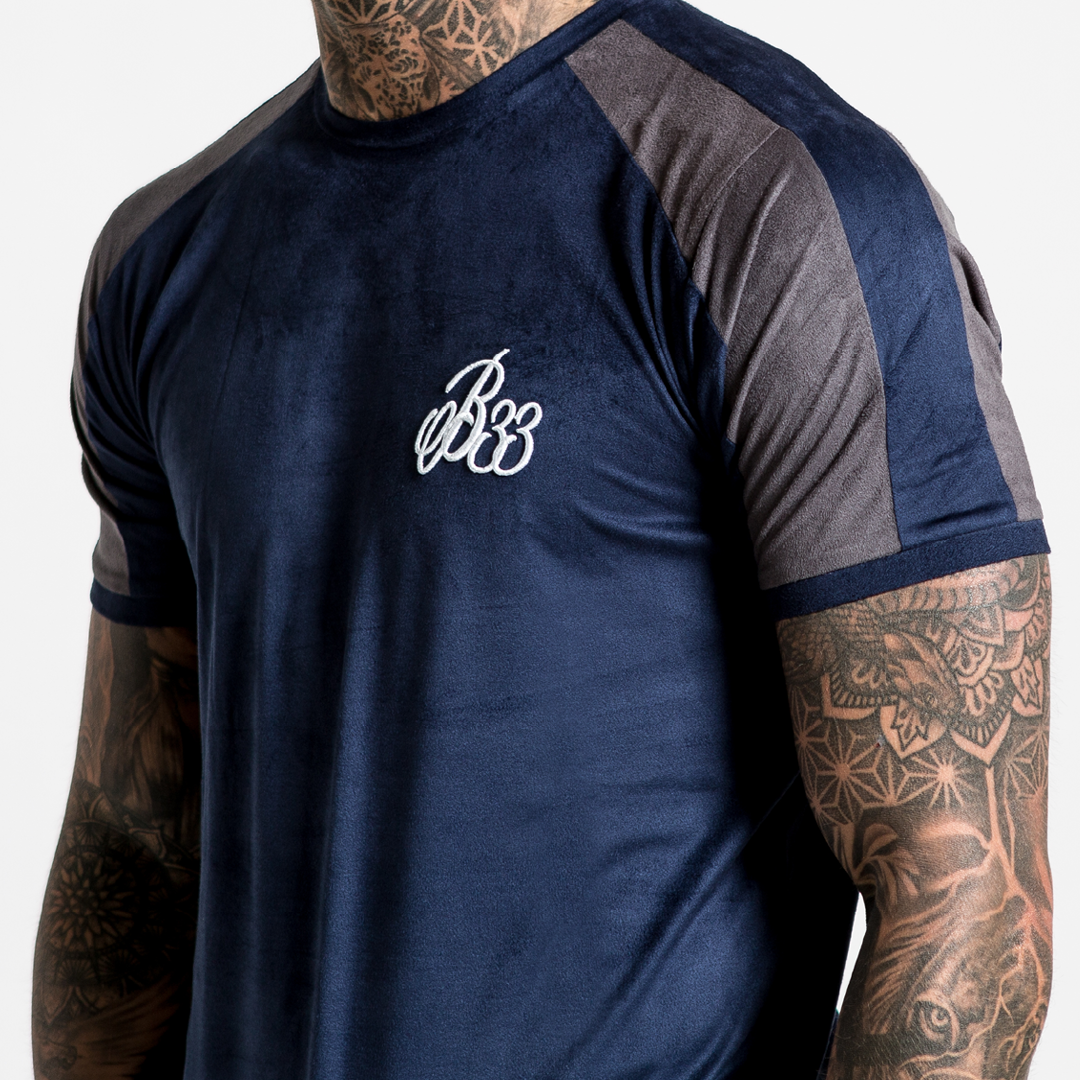 Premium athletic fit curved hem tee in navy constructed from our unique faux suede stretch fabric. Super soft to the touch with contrast raglan set sleeves and B33 embroidery on the left chest.