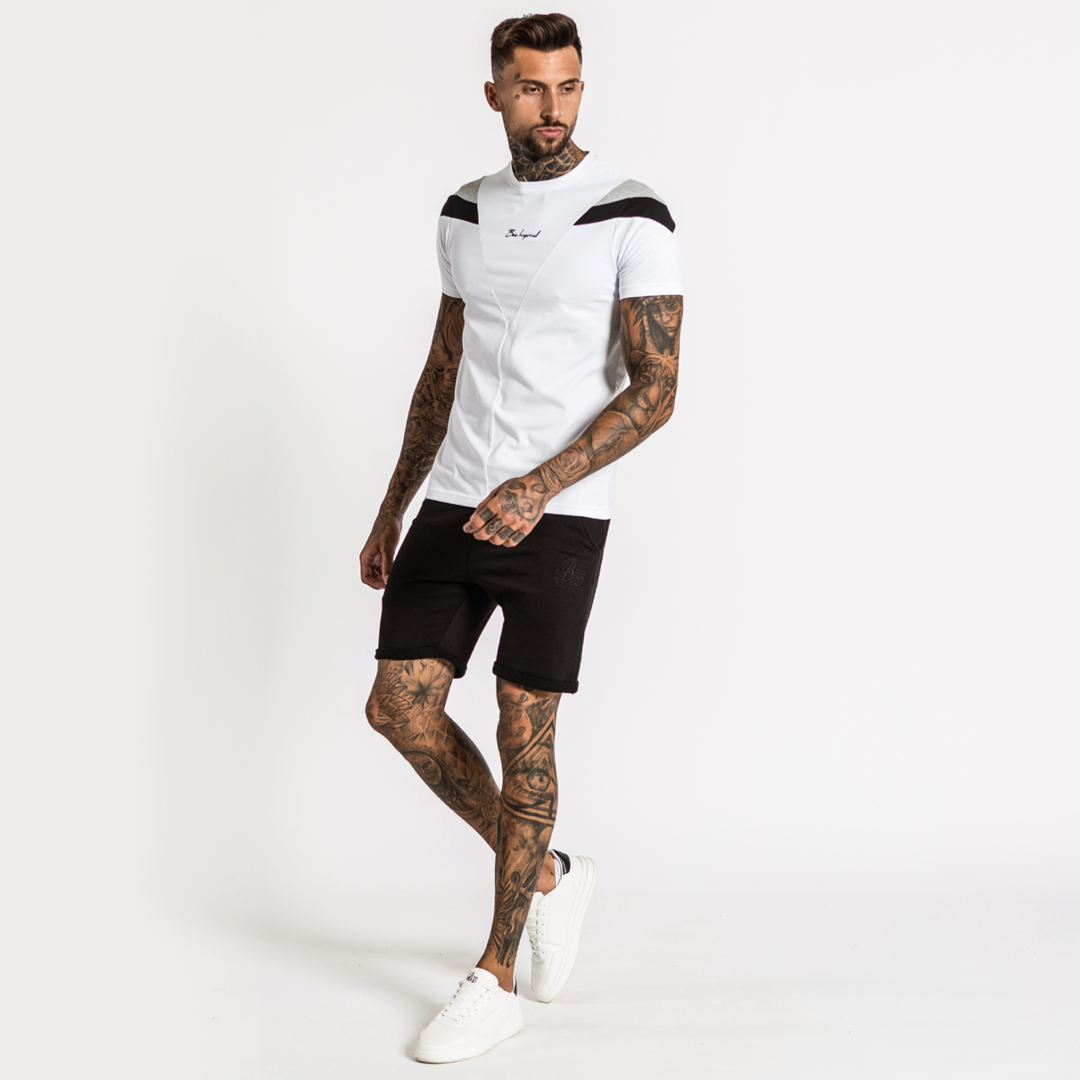 Athletic fit straight hem panel tee in white with grey and black shoulder paneling. Script Bee Inspired logo embroidery features on the central chest