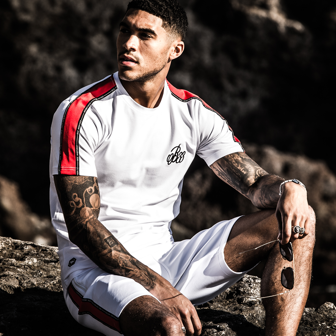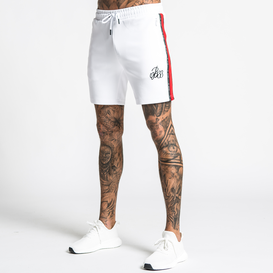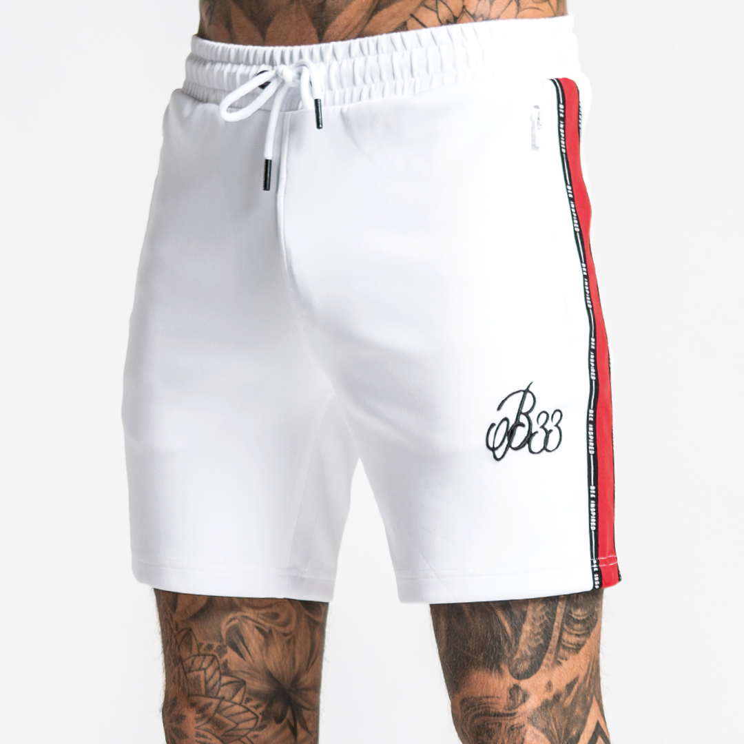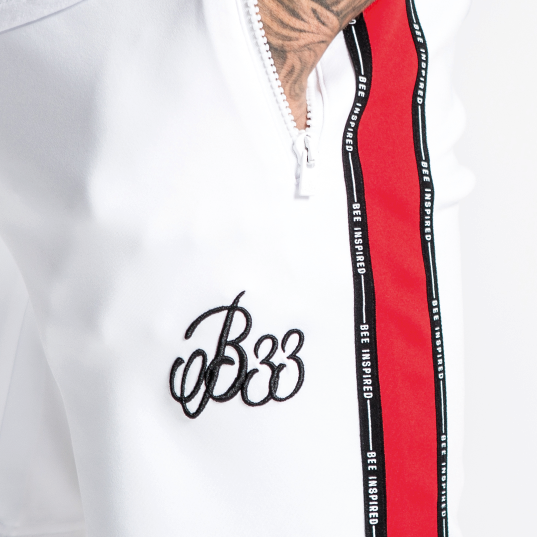 Athletic fit stretch lounge shorts in white with contrast red side stripe w/ Bee Inspired text taping detailing , zipped pockets and B33 embroidery on the left leg.
