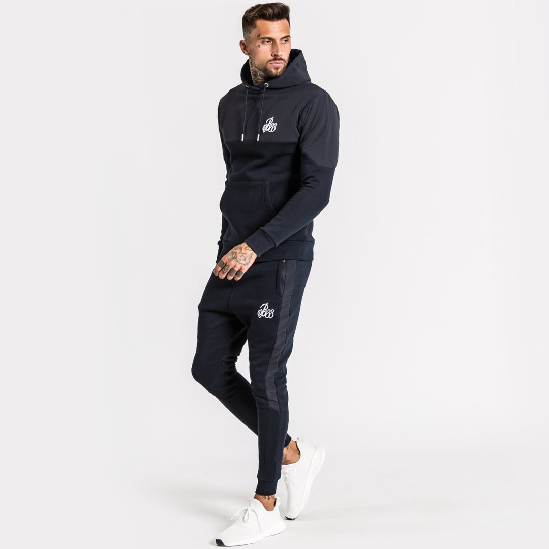Slim fit Athletic sweatpants in navy featuring contrast fabric stripe panel, stretch fit ankle cuff and waist w/ drawstring adjustment and logo embroidery on left leg.
