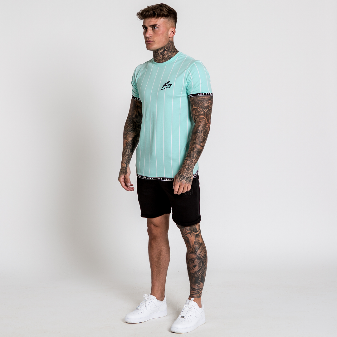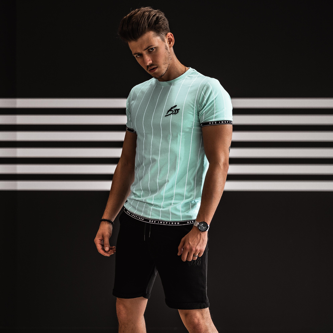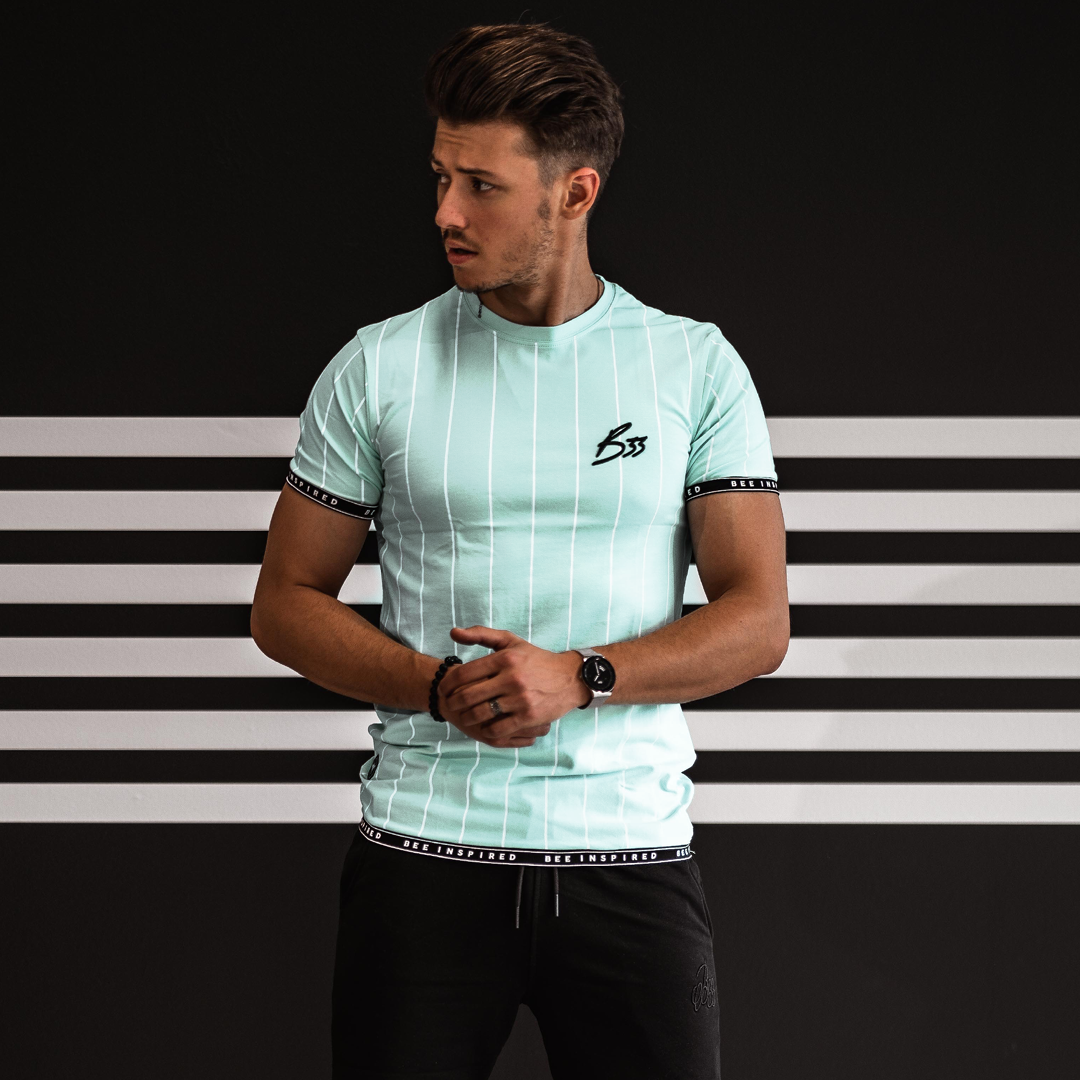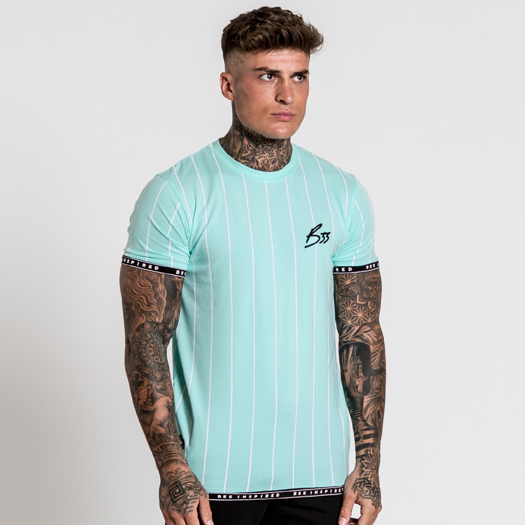 Athletic fit straight hem tee in jade with a white pinstripe design and Bee Inspired stretch taping on the sleeve and hem.