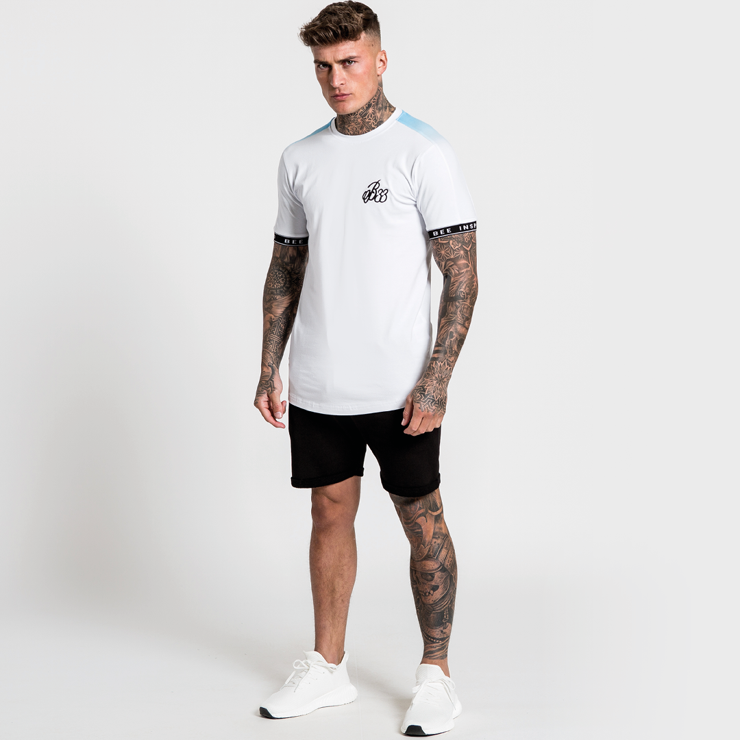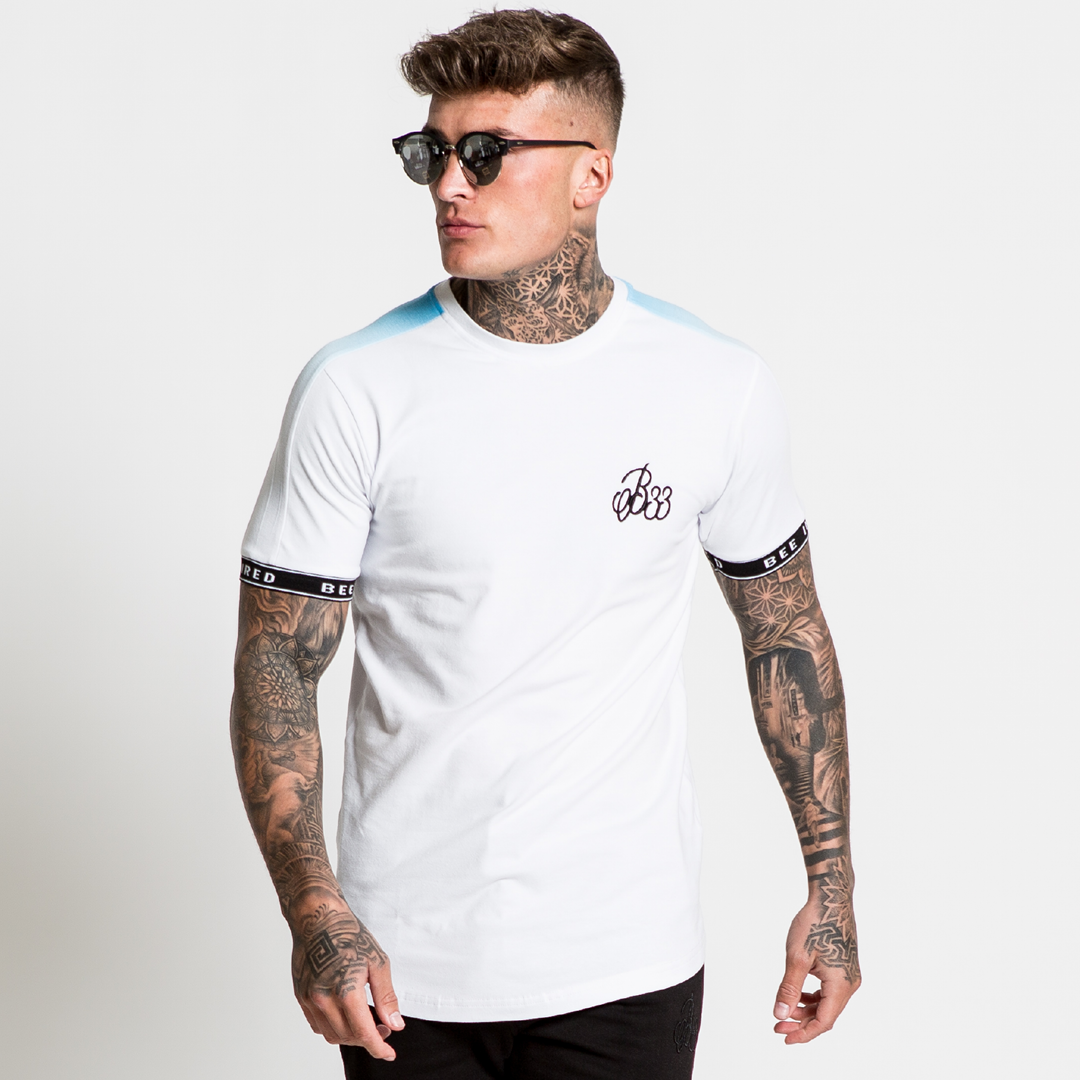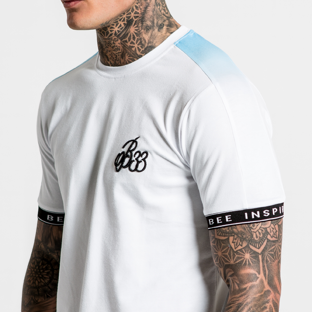 Athletic style stretch cotton tee in white featuring aqua fade panelling on the shoulders and Bee Inspired custom taping on the arm cuffs.