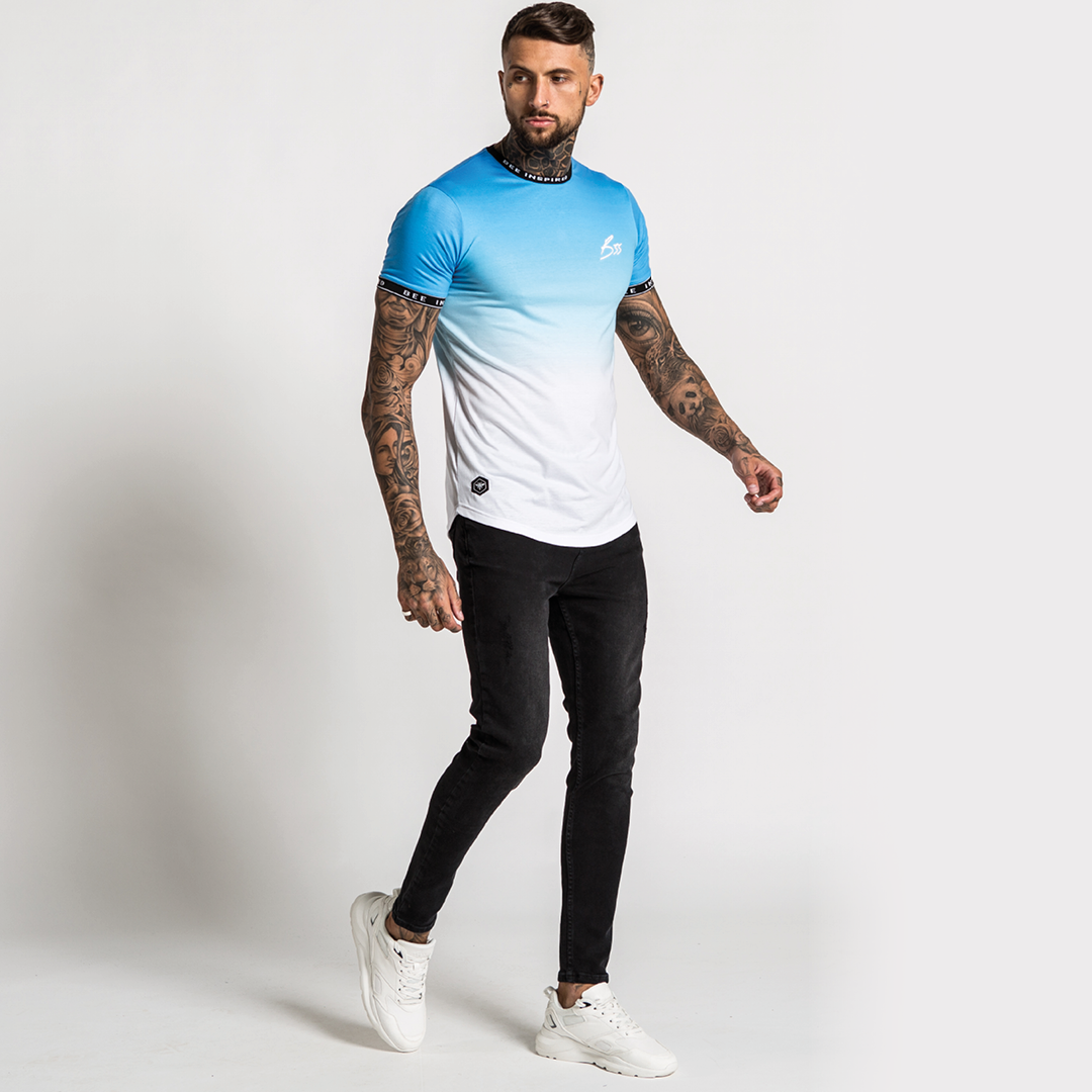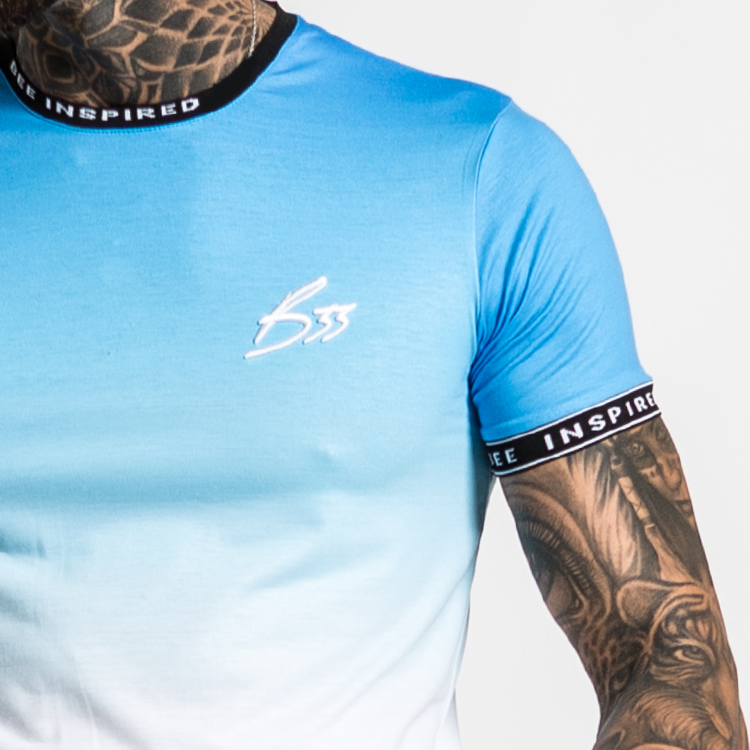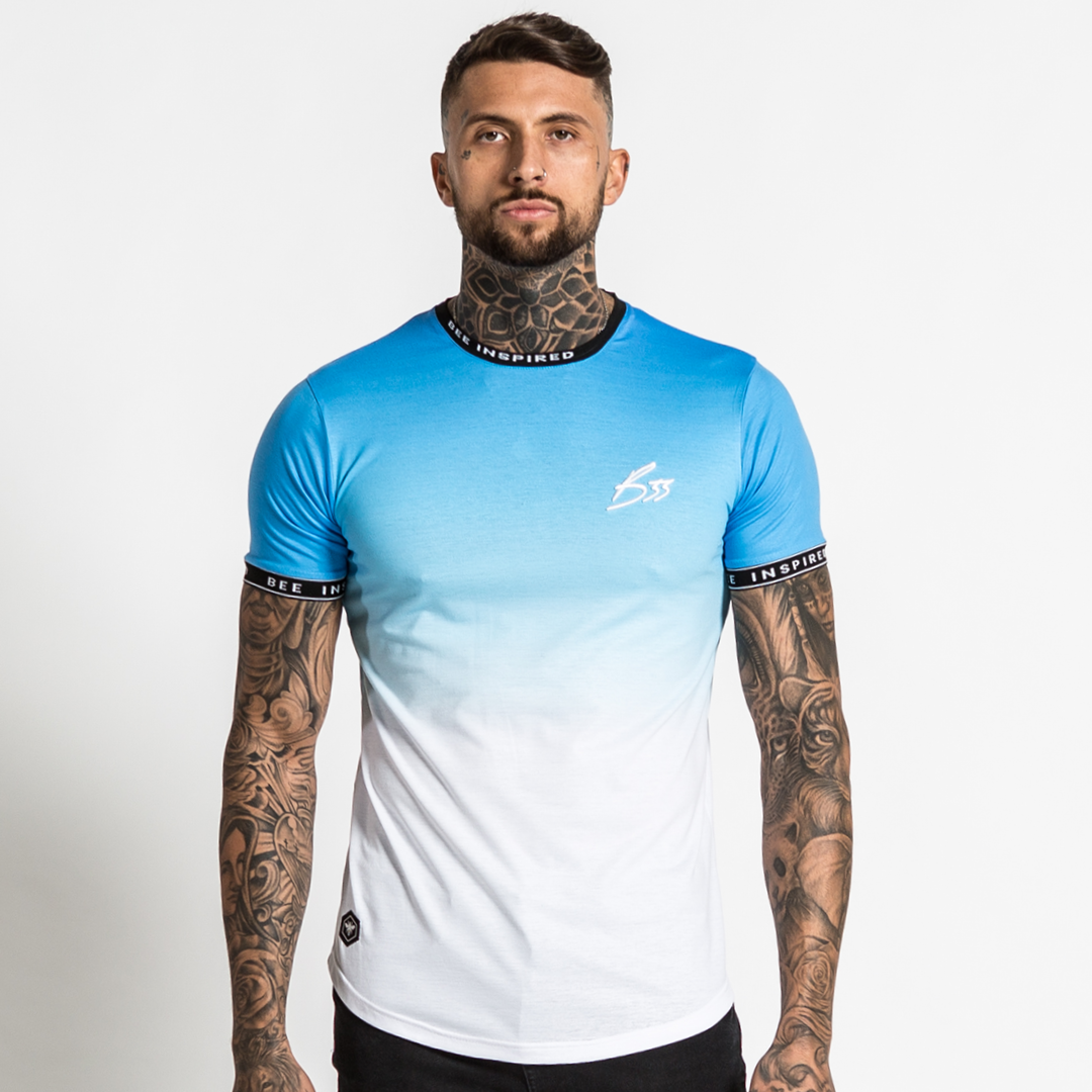 Athletic style stretch cotton tee in Blue fade featuring Bee Inspired custom taping on the collar and arm cuffs.