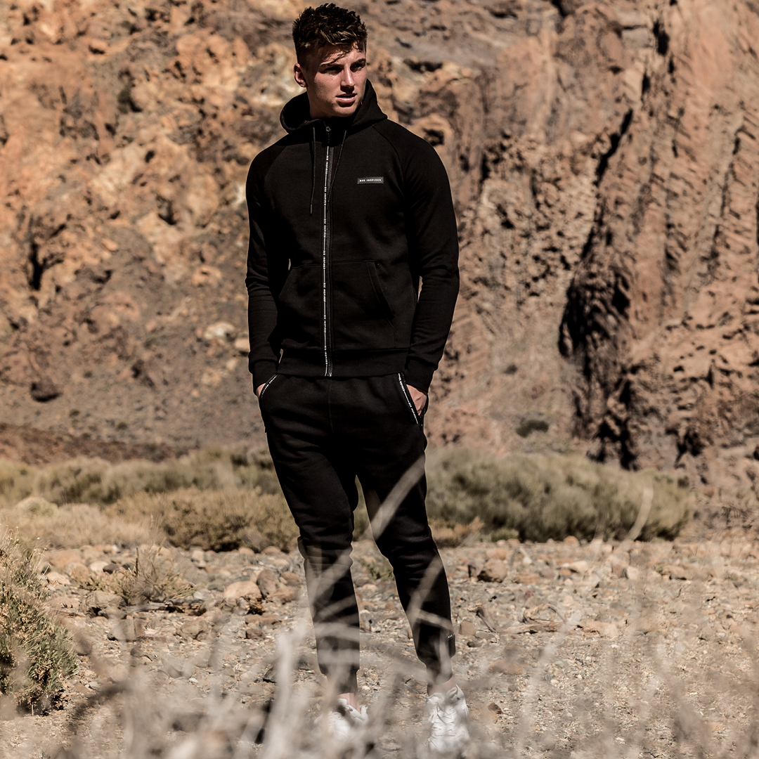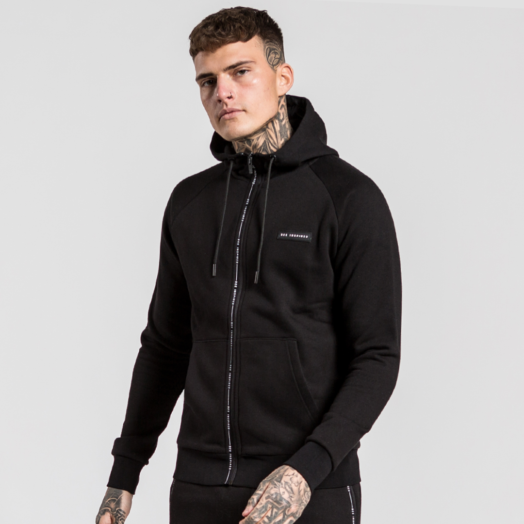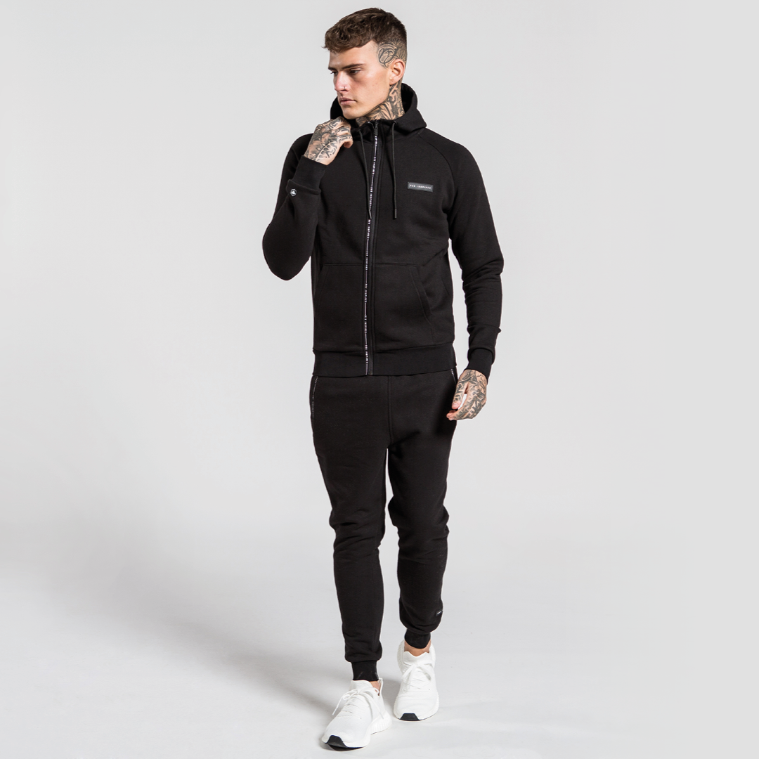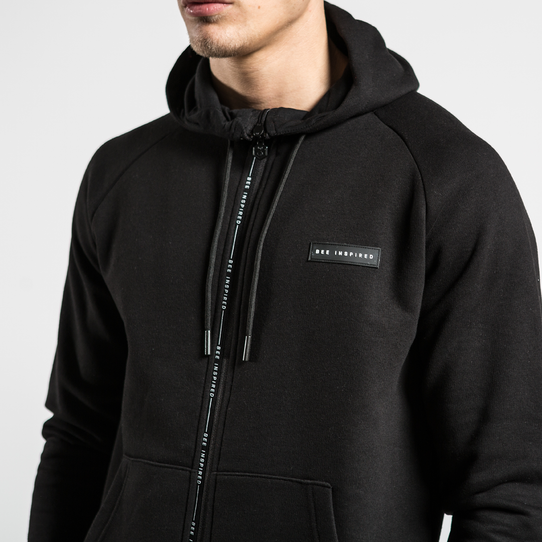 Athletic zipped hoodie in black with unique branded taping zip closure and embossed rubber badge branding on the left chest.