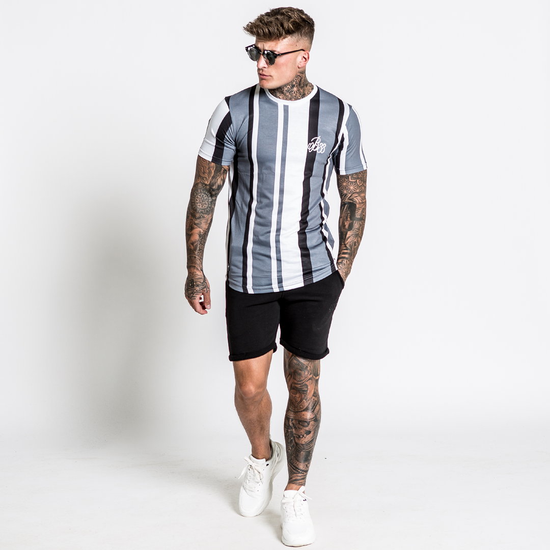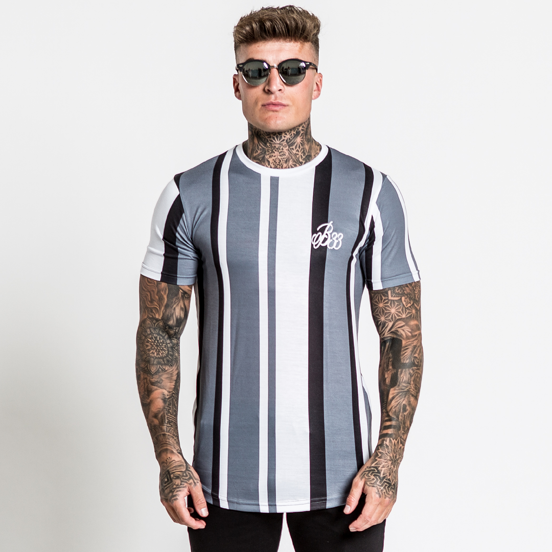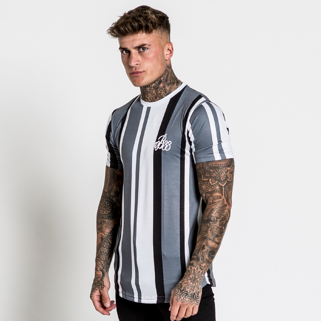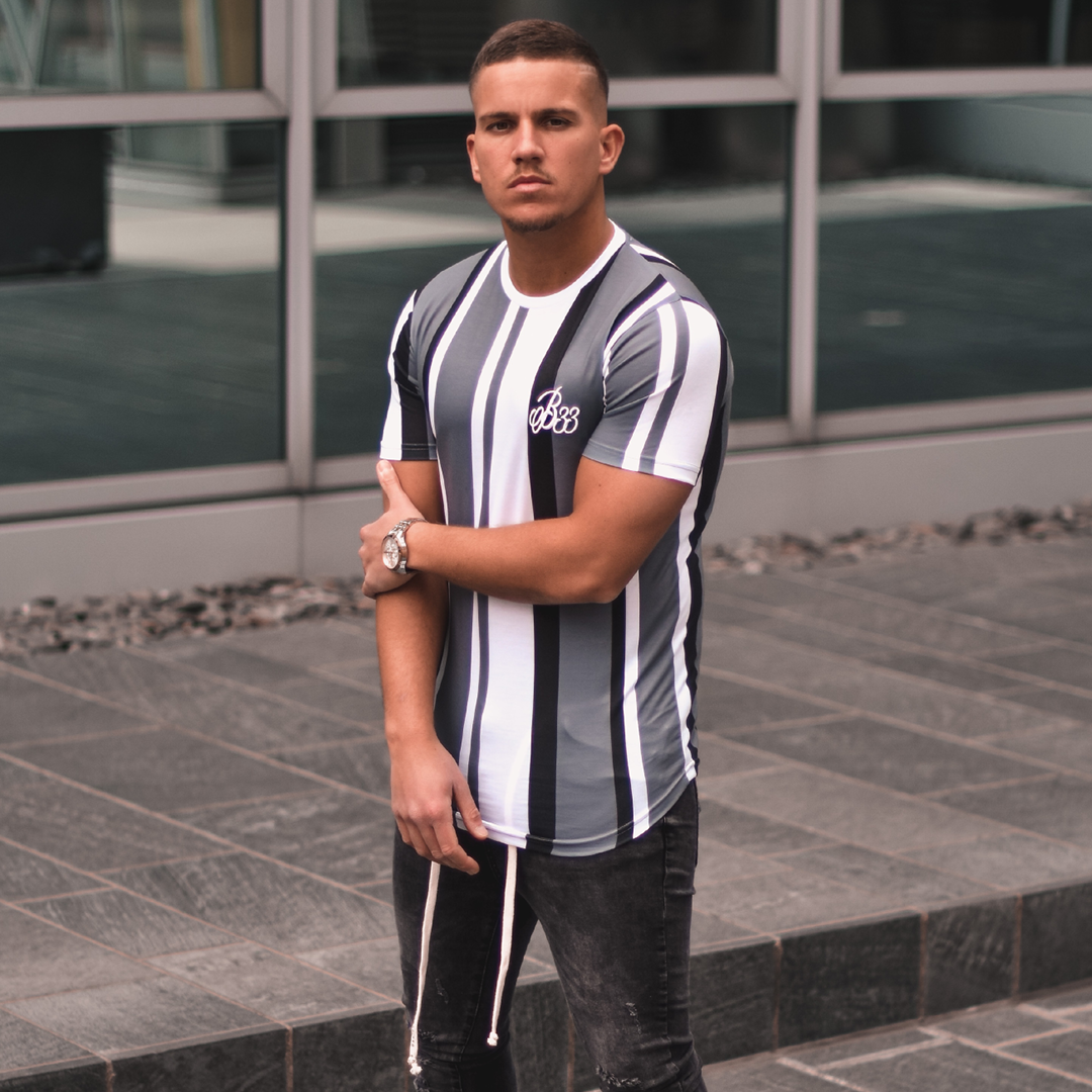 Athletic fit straight hem tee in a bold striped design, featuring B33 embroidery on the left chest with a curved hem.