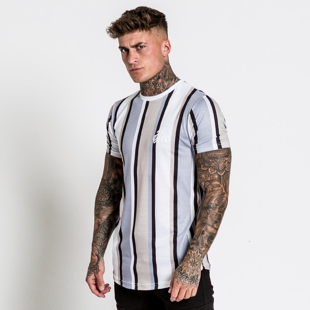Athletic fit straight hem tee in a bold striped design, featuring B33 embroidery on the left chest with a curved hem.