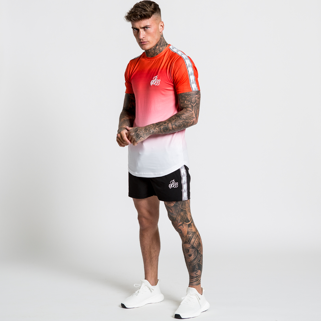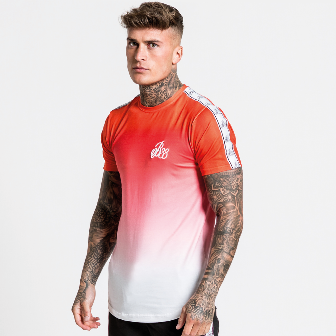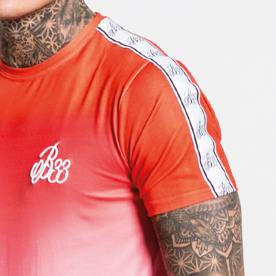 Athletic style stretch tee in red fade featuring custom B33 taping on the shoulders.