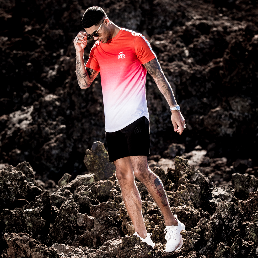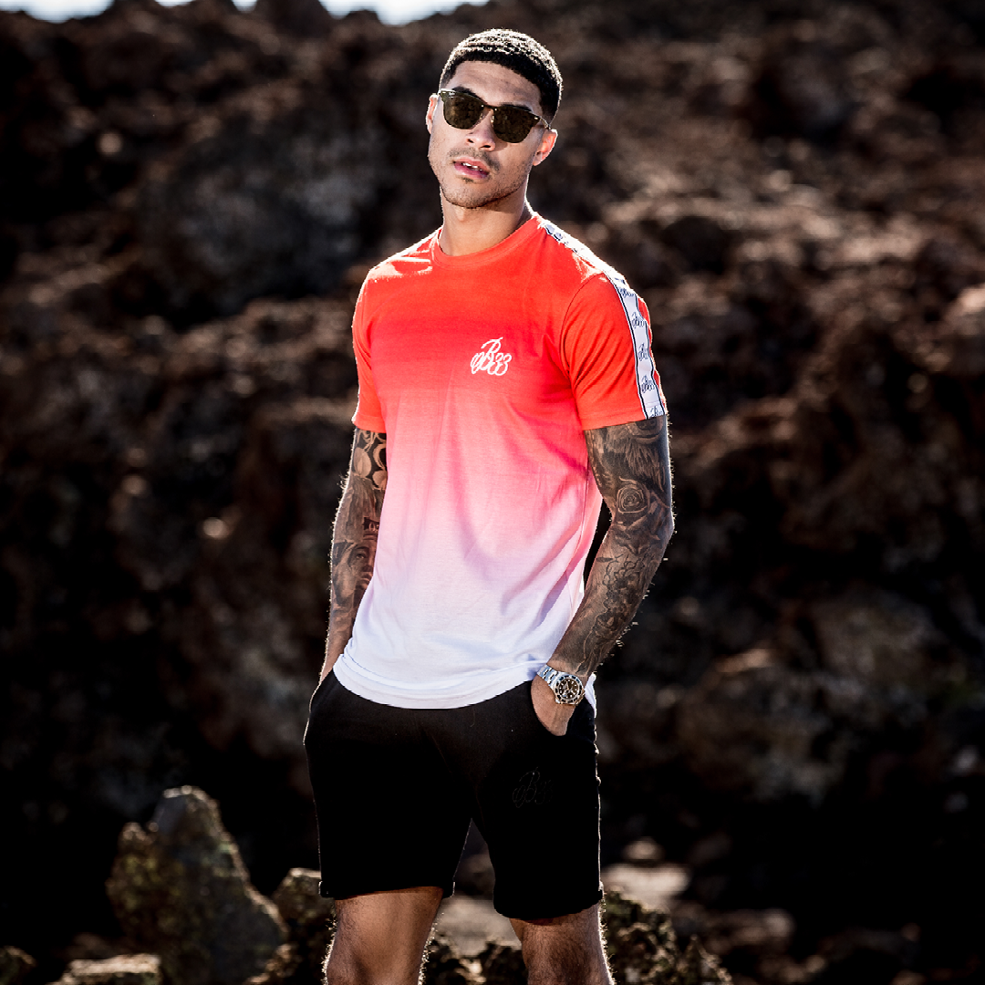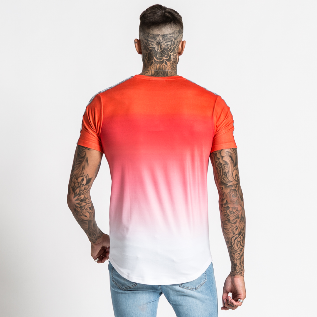 Athletic style stretch tee in red fade featuring custom B33 taping on the shoulders.