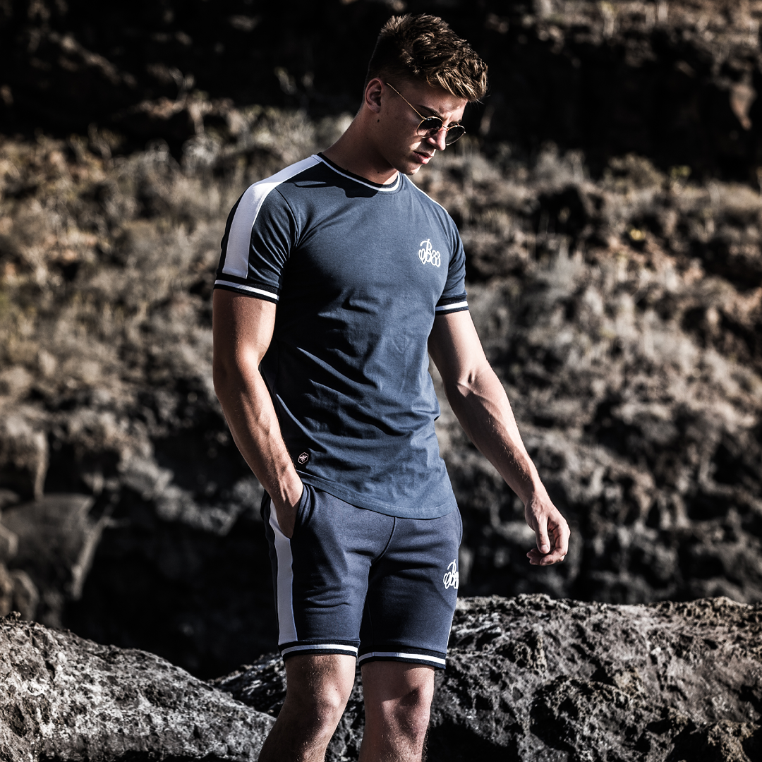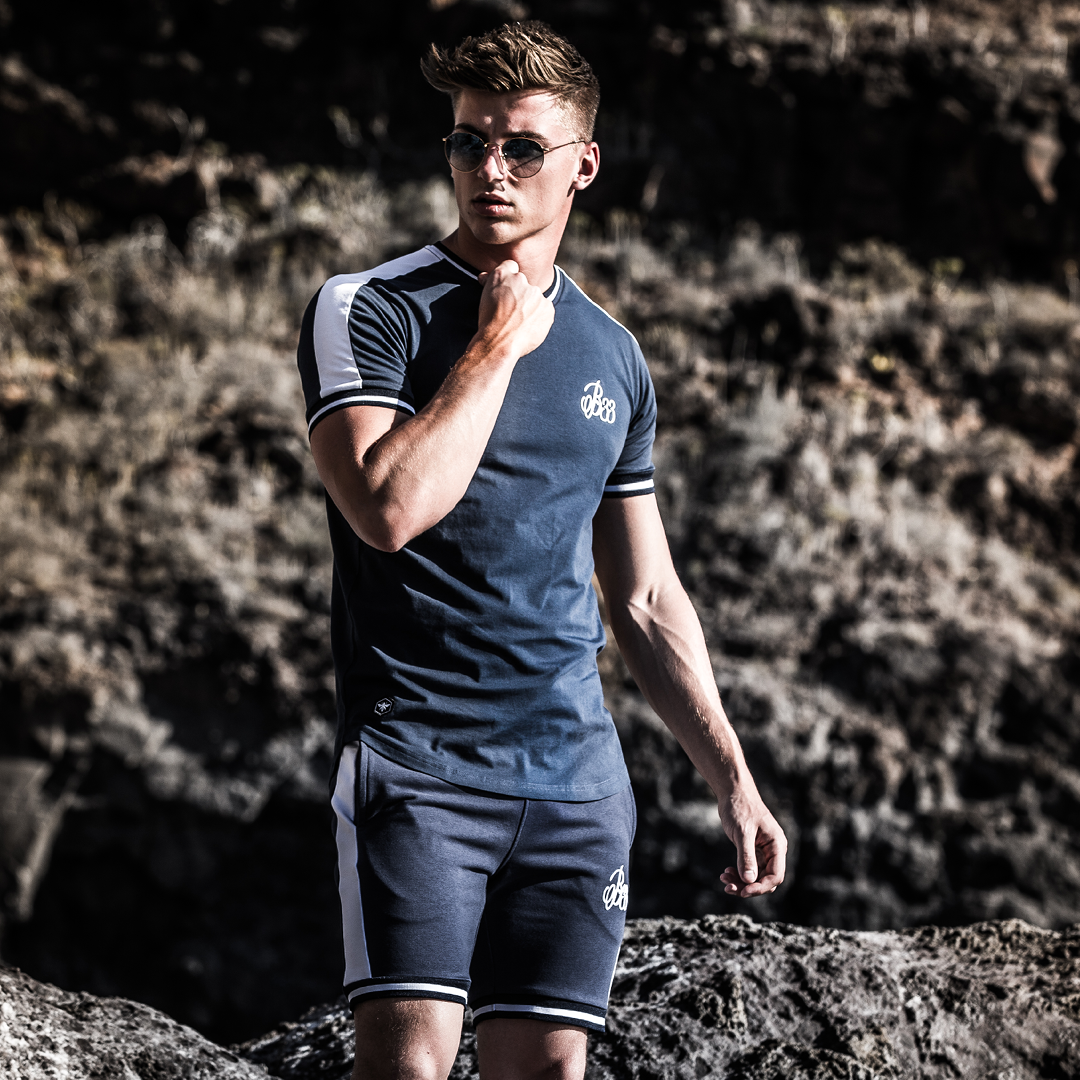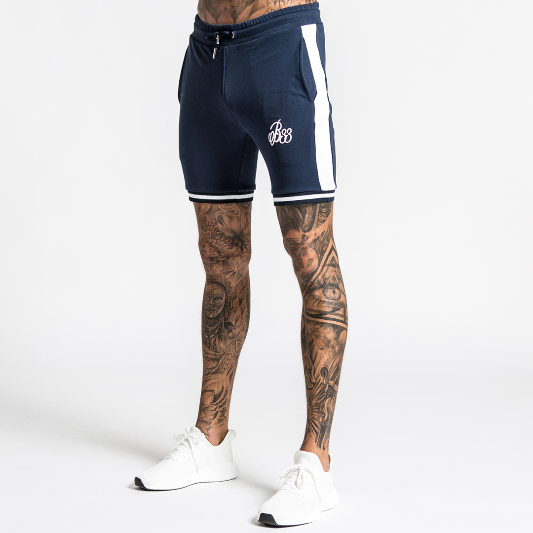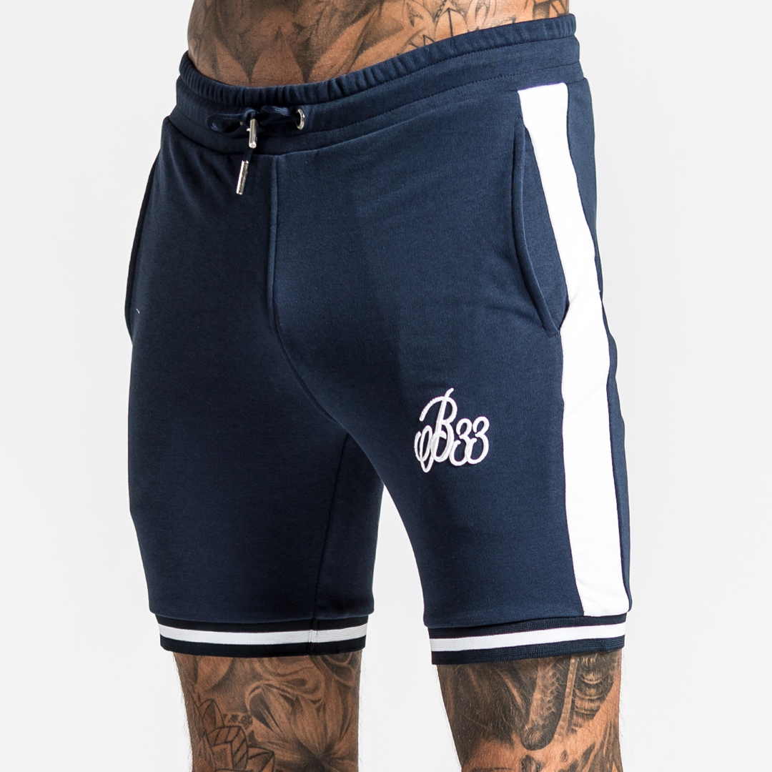Athletic fit stretch cotton shorts in navy with contrast white side stripe, drawstring adjustment , custom stretch fit stripe cuffs and B33 embroidery on the left leg.