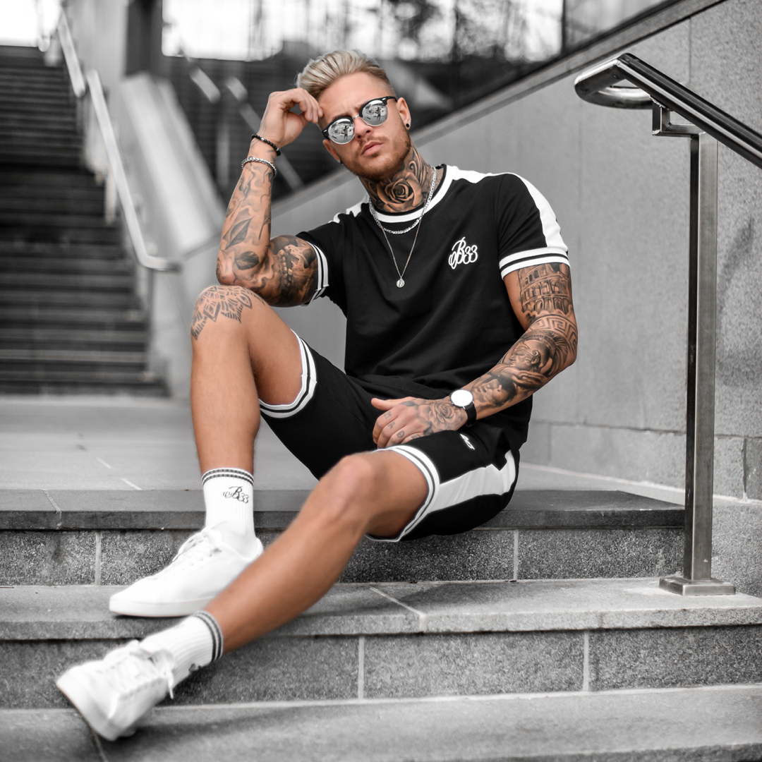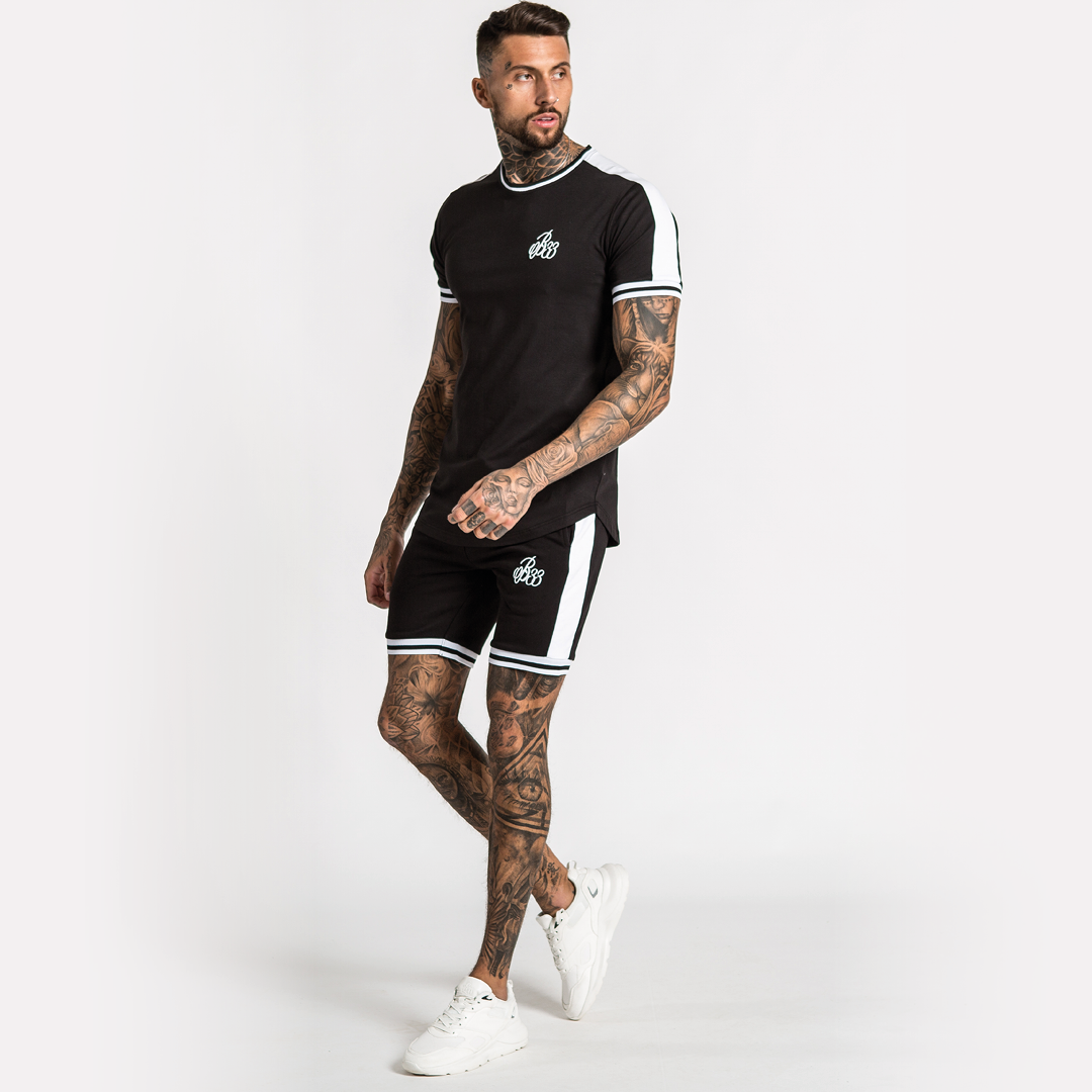 Athletic style stretch cotton tee in black featuring stretch fit stripe collar and arm cuff and B33 embroidery on the left chest.