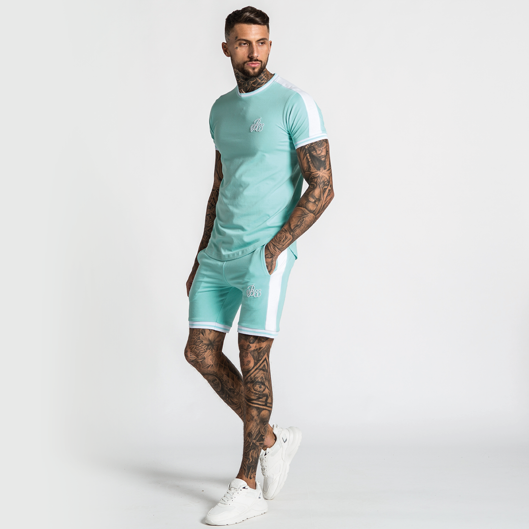 Athletic style stretch cotton tee in jade featuring stretch fit stripe collar and arm cuff and B33 embroidery on the left chest.