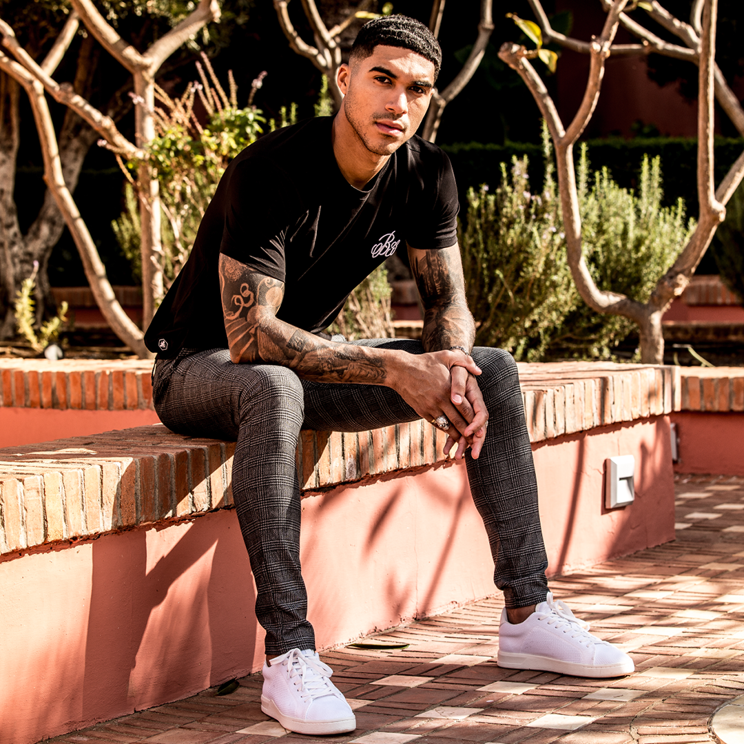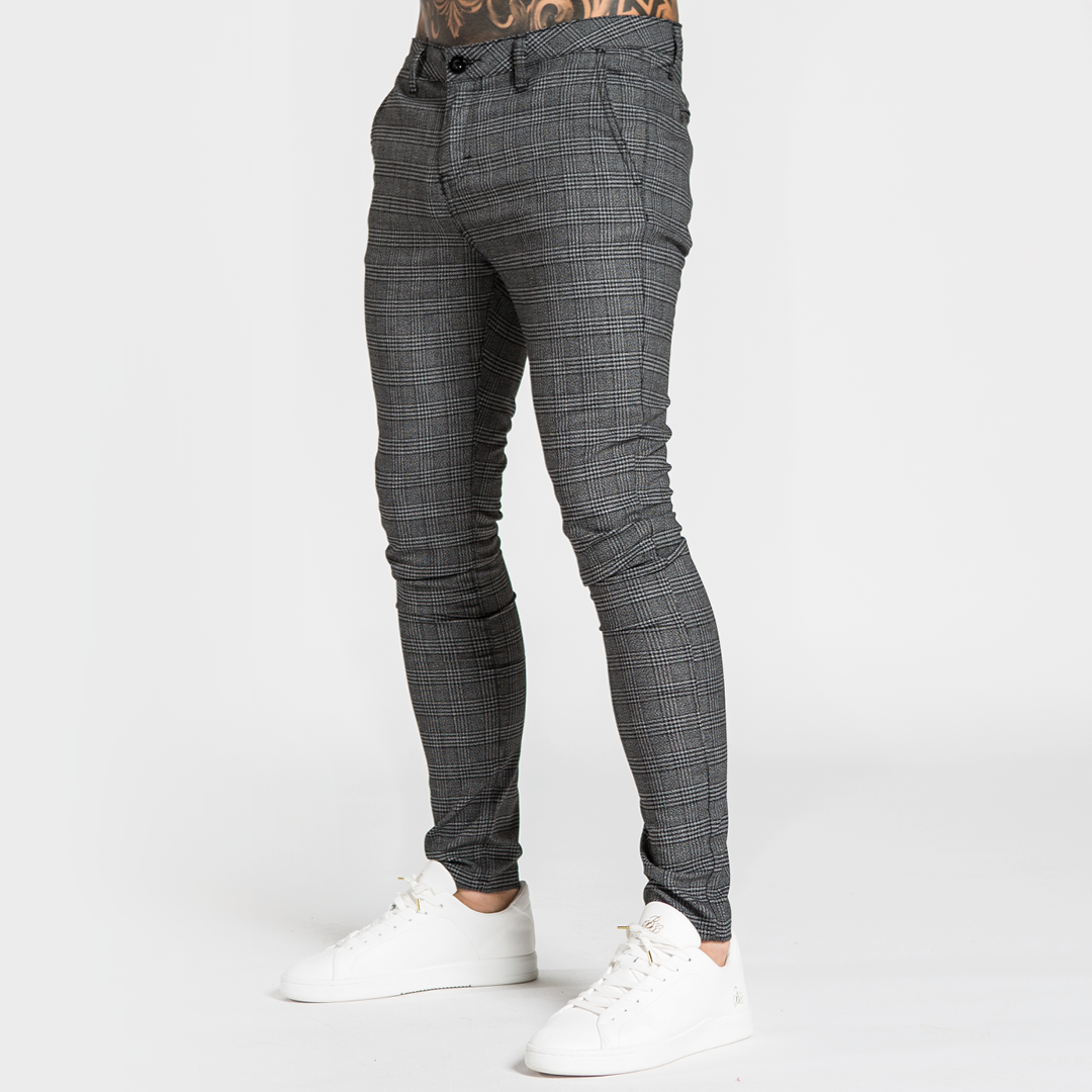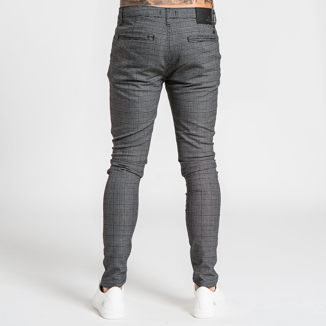 Best selling chinos in a black/grey check featuring 5 loop belt design, faux leather waist patch and our custom stretch chino fabric