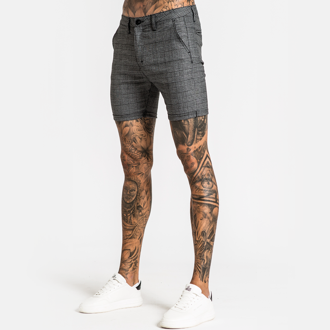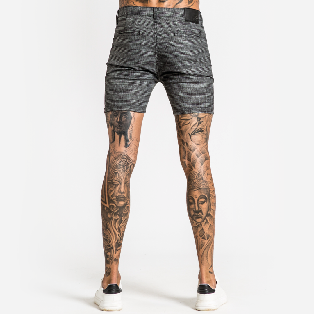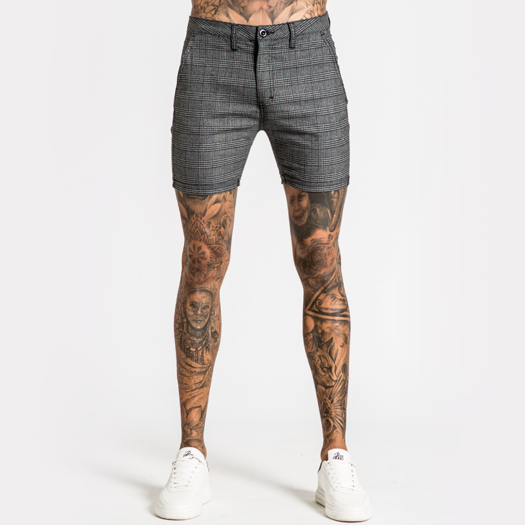 Best selling chino shorts in a black/grey check featuring 5 loop belt design, faux leather waist patch and our custom stretch chino fabric