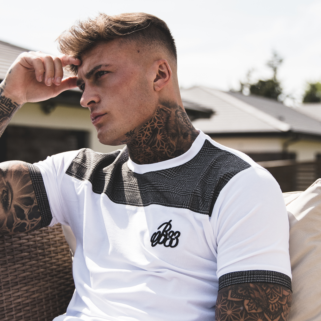 Athletic fit straight hem tee in white with our Oslo Chino check pattern printed on the upper chest panel. B33 embroidery features on the left chest