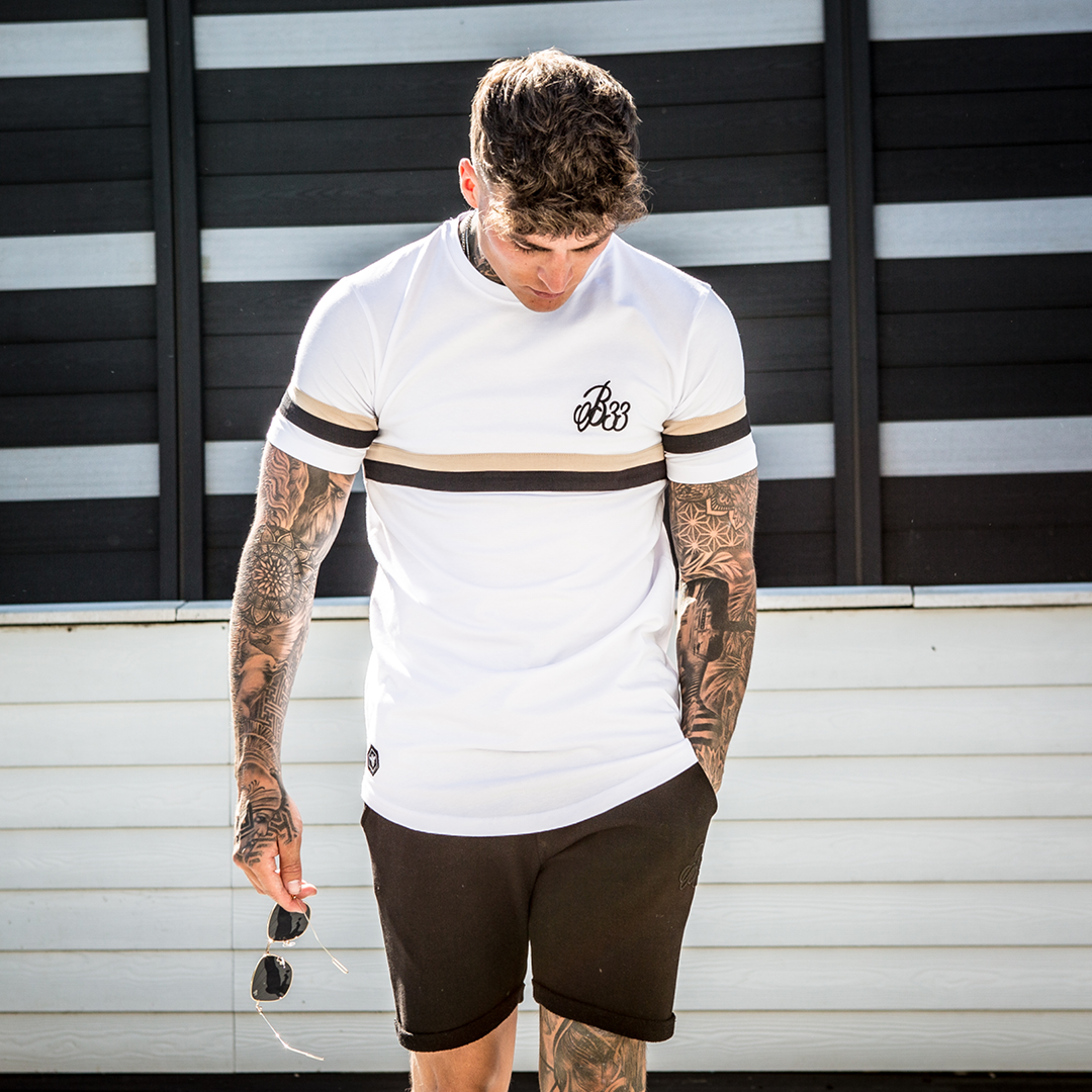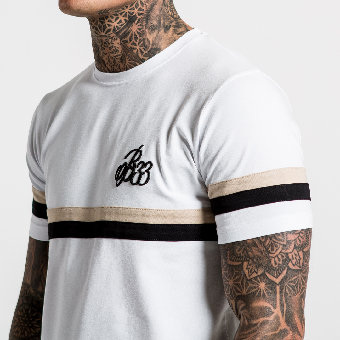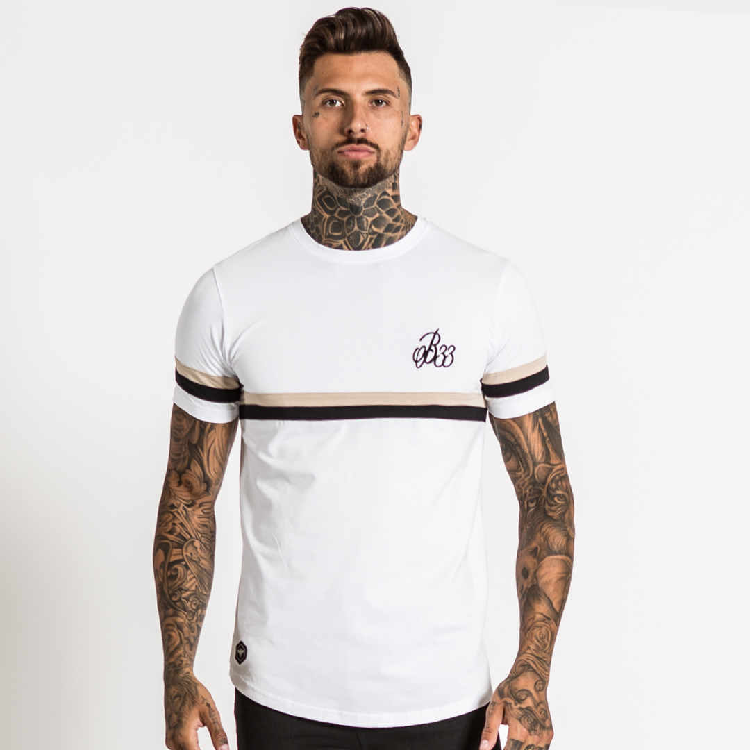 Athletic style stretch cotton tee in white featuring dual stripe panelling across the lower chest and iconic B33 embroidery on the left chest.