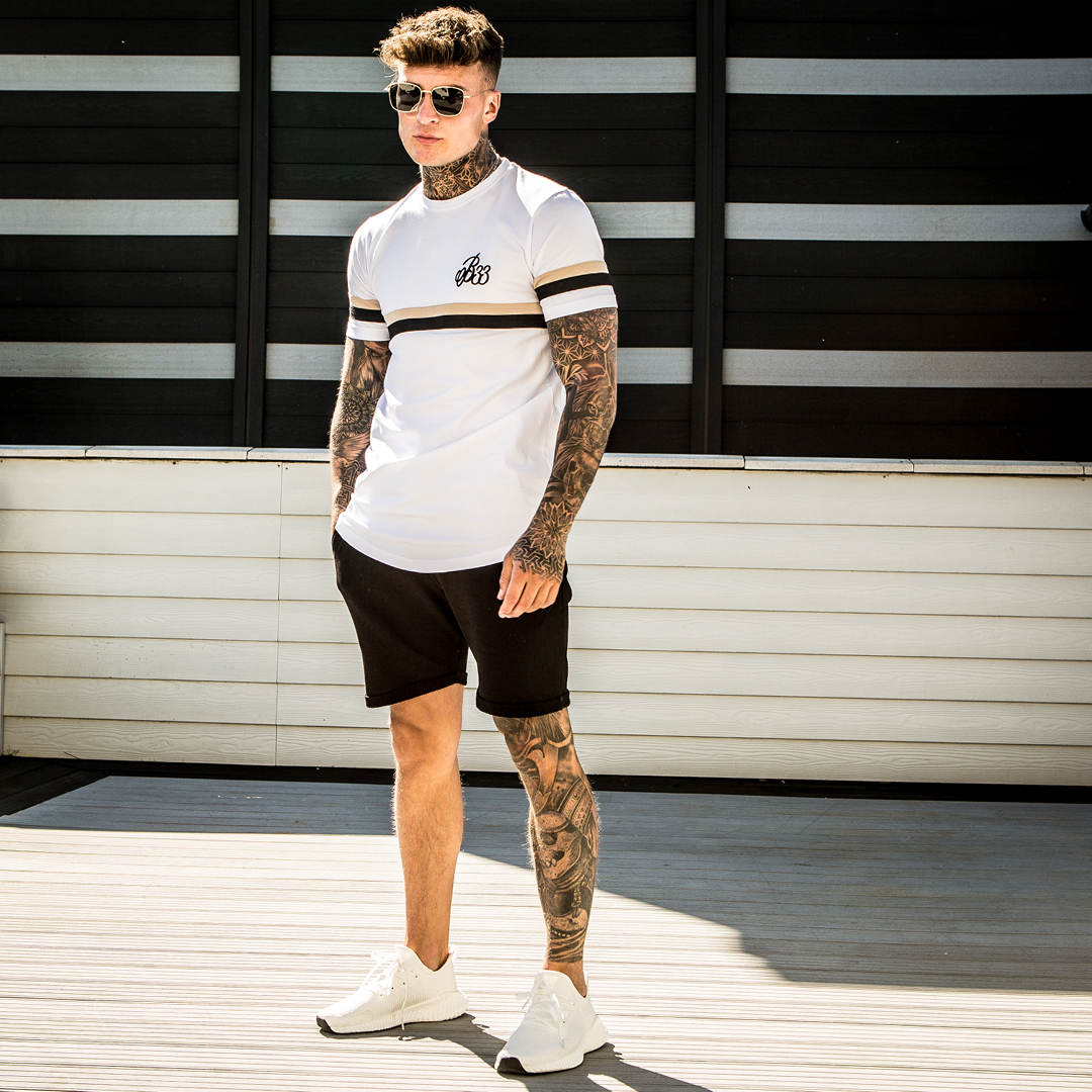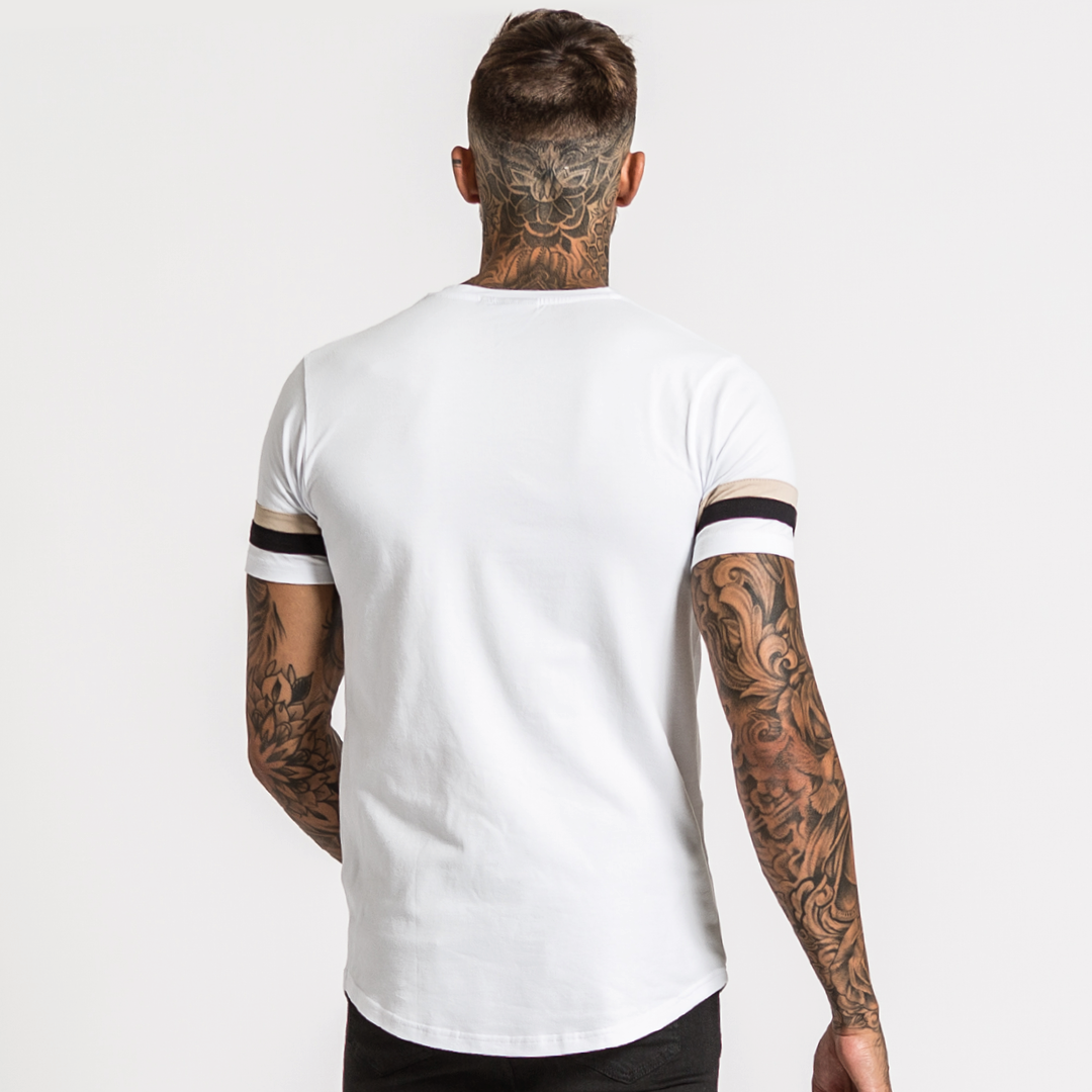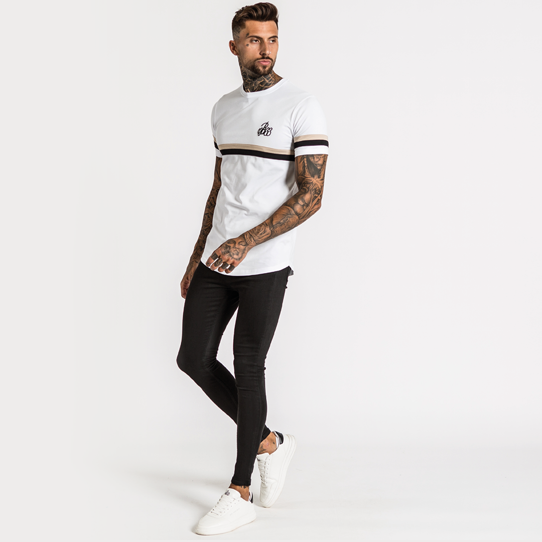 Athletic style stretch cotton tee in white featuring dual stripe panelling across the lower chest and iconic B33 embroidery on the left chest.