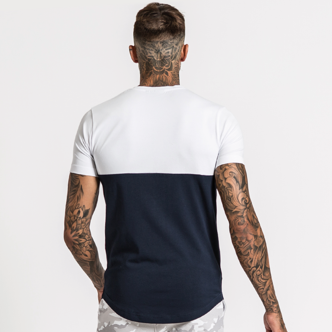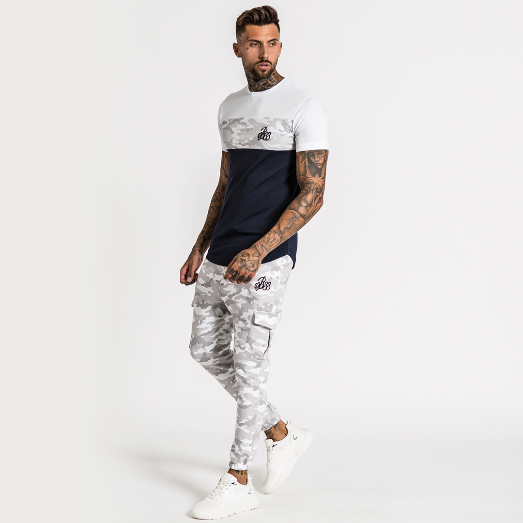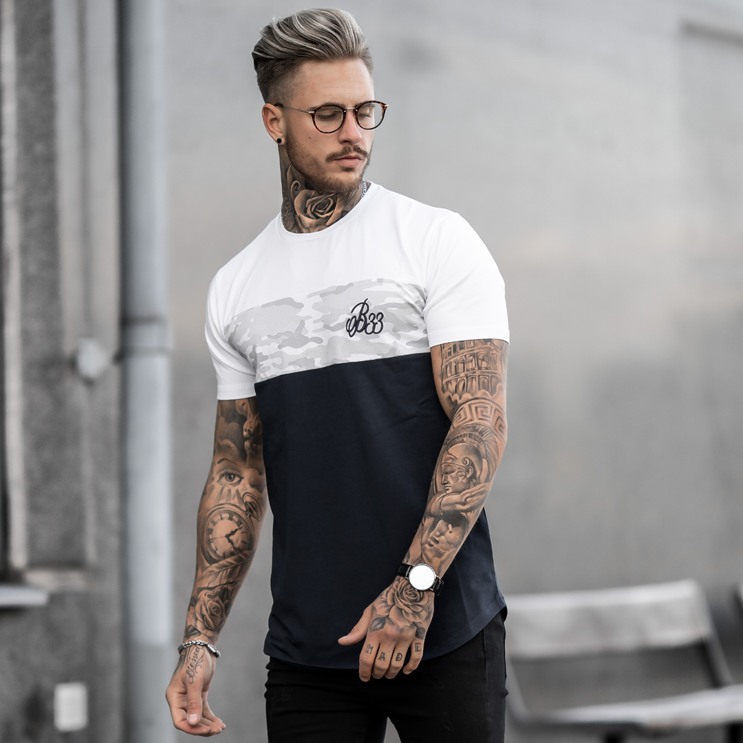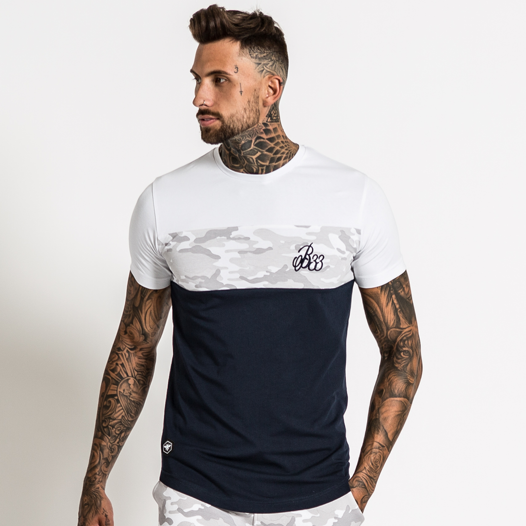 Athletic style stretch cotton tee in white/navy with cut and sew grey camo panel. Featuring a curved hem and iconic B33 branding on the left chest.