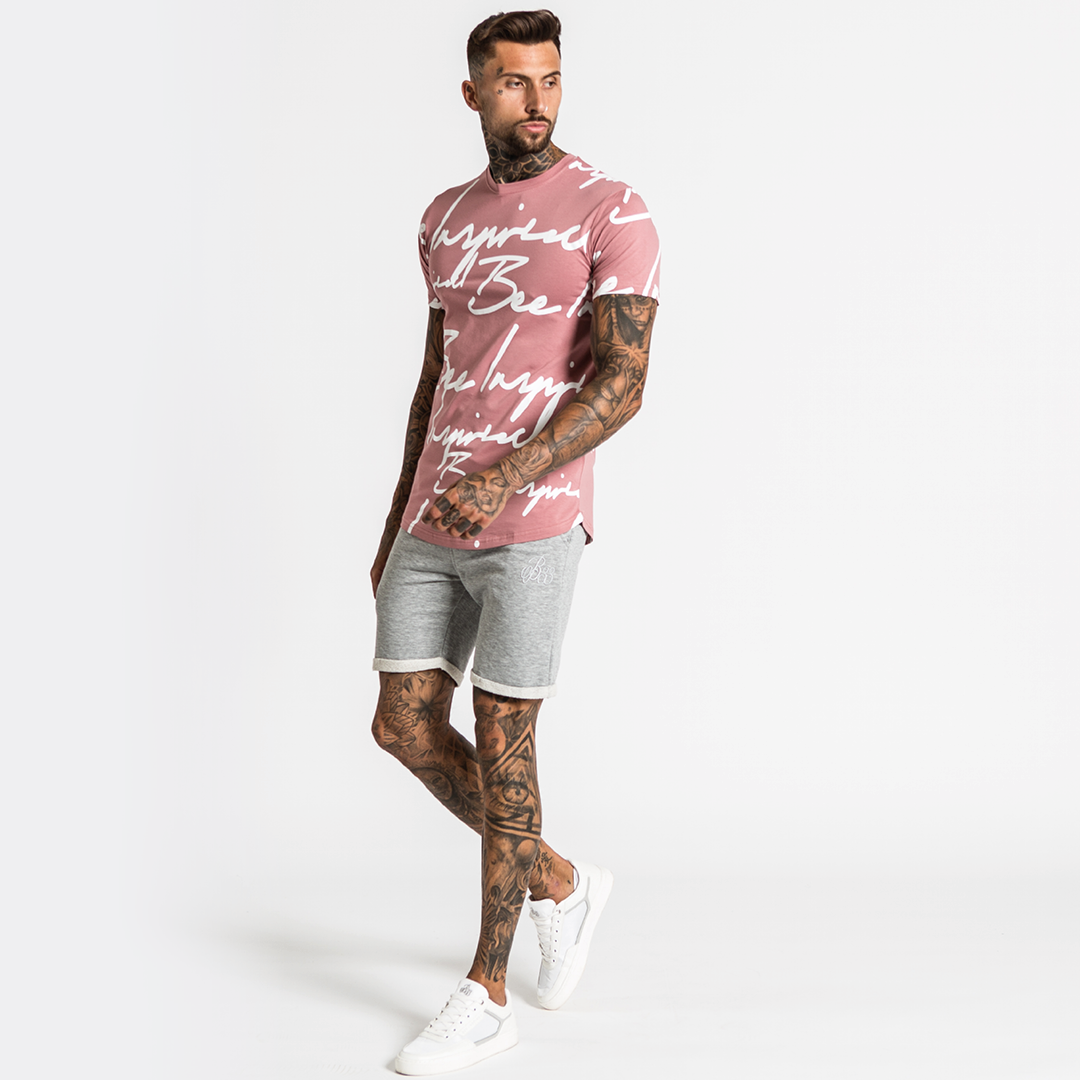 Athletic style stretch cotton tee in pink featuring an all over custom Bee Inspired script print.