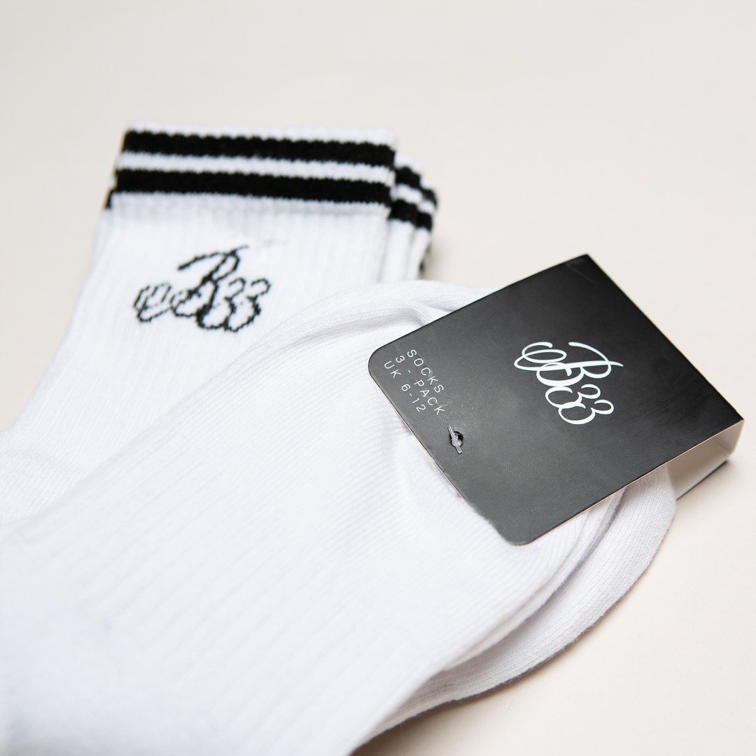 Tube socks have quickly become the go to for this seasons footwear trends, completing the trainers and shorts look. Constructed in ultra comfortable cotton with elastic effect ribbing, to stay secure on any foot. Featuring our iconic B33 branding on both the side and outside leg.